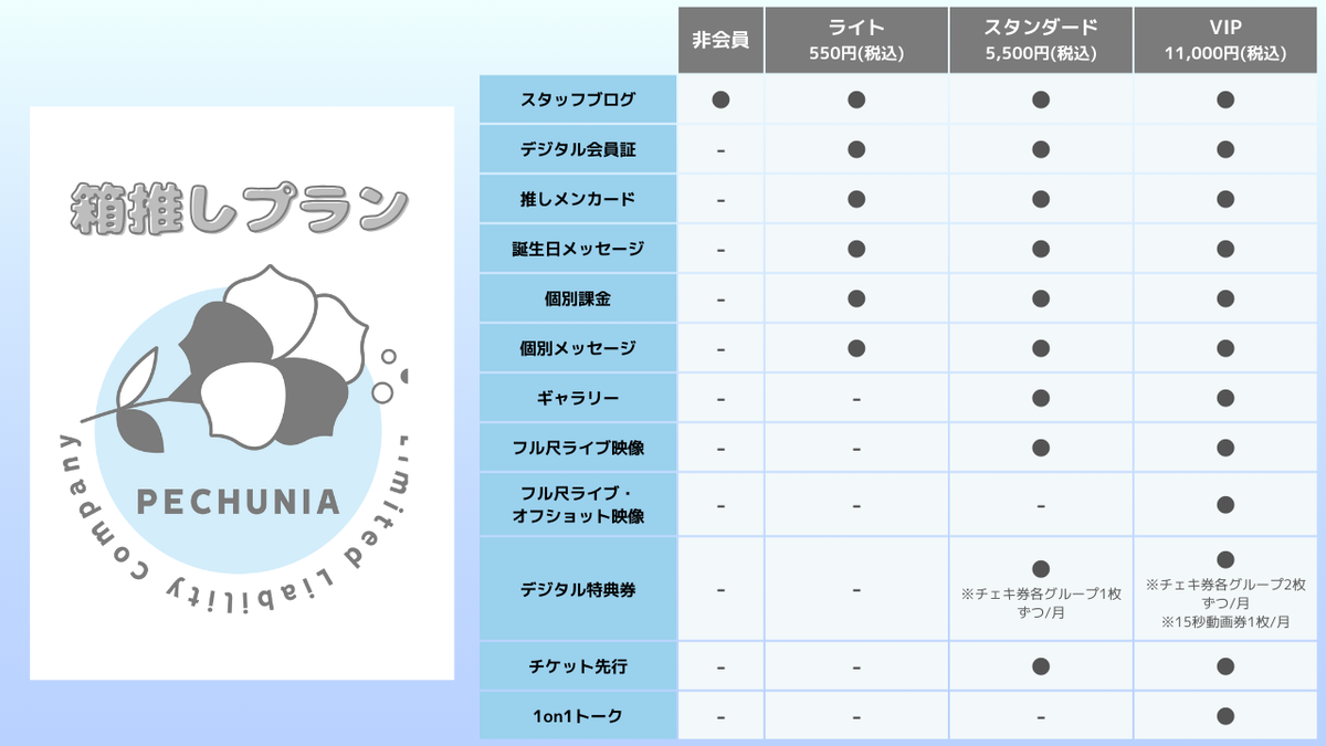 誕生日メッセージ、個別メッセージ、FC先行チケット販売、マイトークや各グループをまとめて応援できるお得な「pechuniaプラン」をご用意!