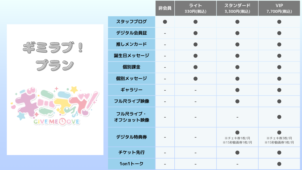 毎月スタンダードプラン以上の方にチェキ撮影券、15秒動画撮影券を付与いたします。